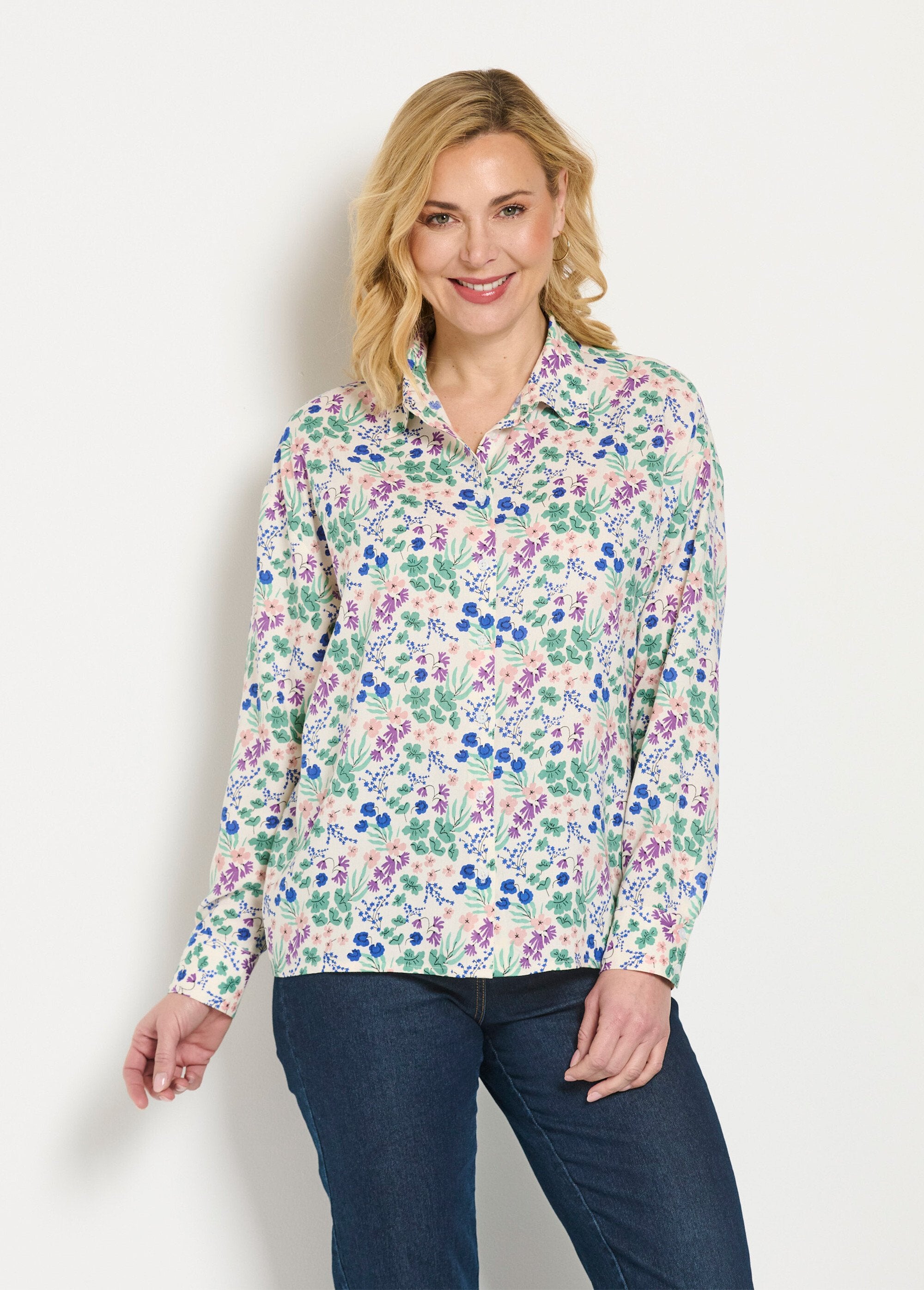 Las flores adquieren bonitos colores en una blusa de mujer, ideal para entretiempo. Para un look femenino, lo combinarás con una falda recta lisa y zapatos de tacón. Para un look más moderno, elija pantalones anchos y zapatillas de cuña.