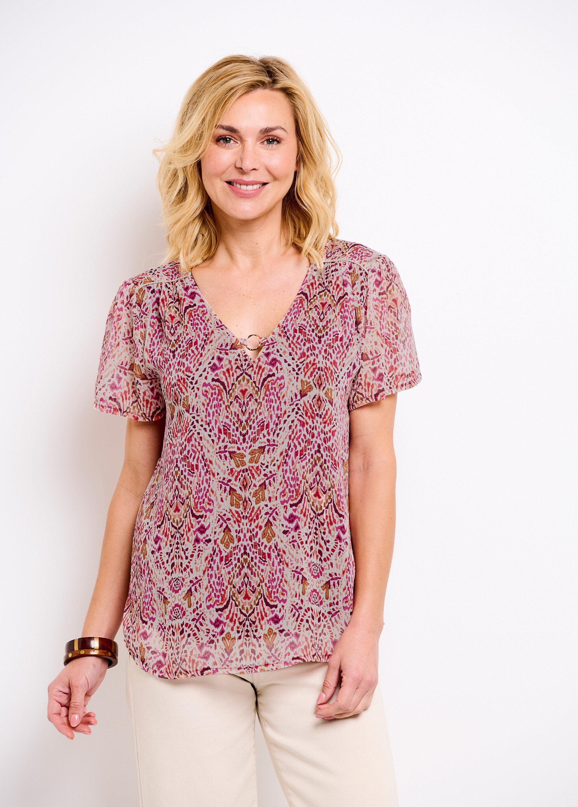 Con su estampado de inspiración étnica de tendencia y su original escote, la túnica de mujer embellece todos los looks cotidianos. Genial con jeans y zapatillas de deporte, da un toque bohemio con una falda larga con volantes y sandalias de cuña.