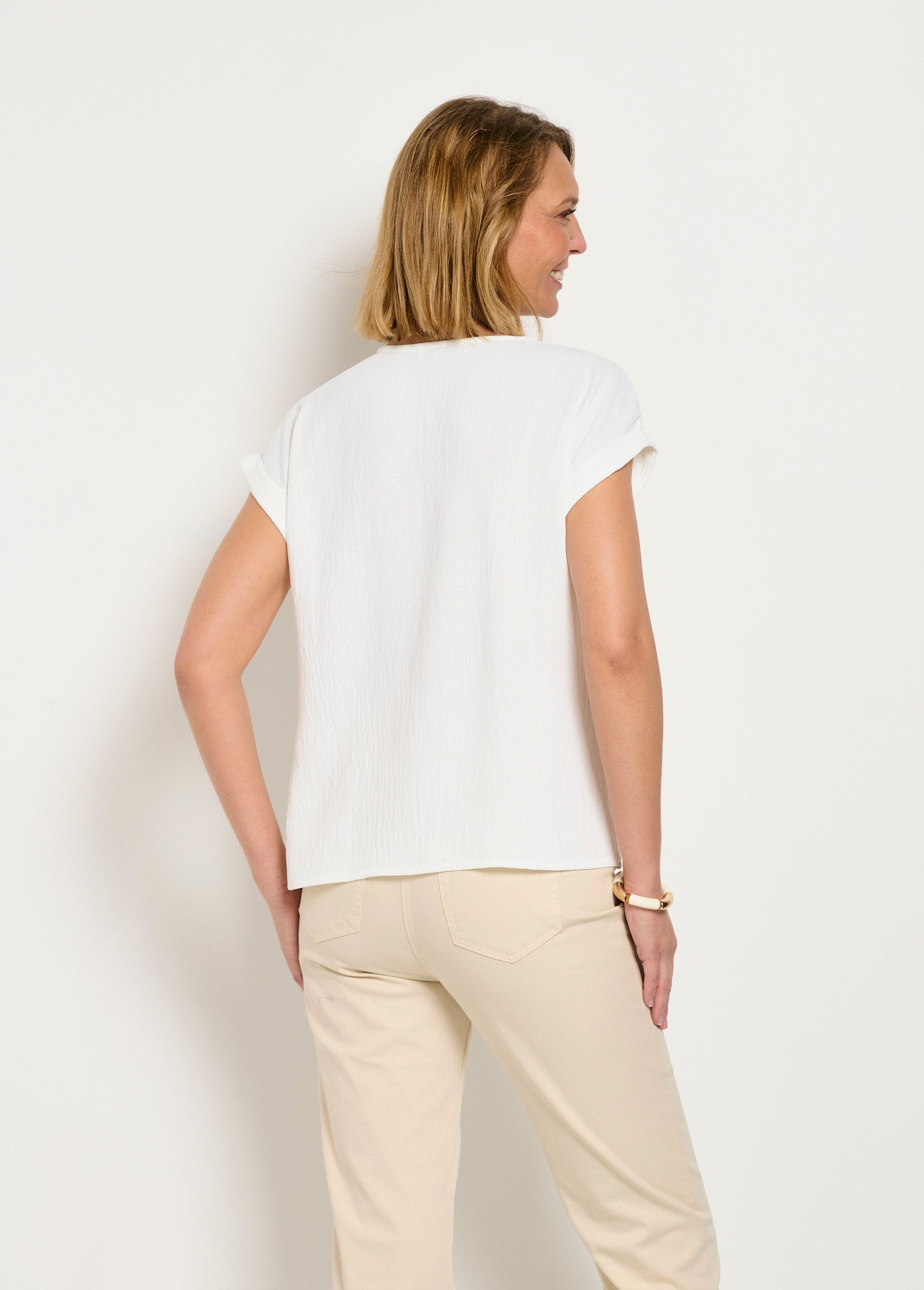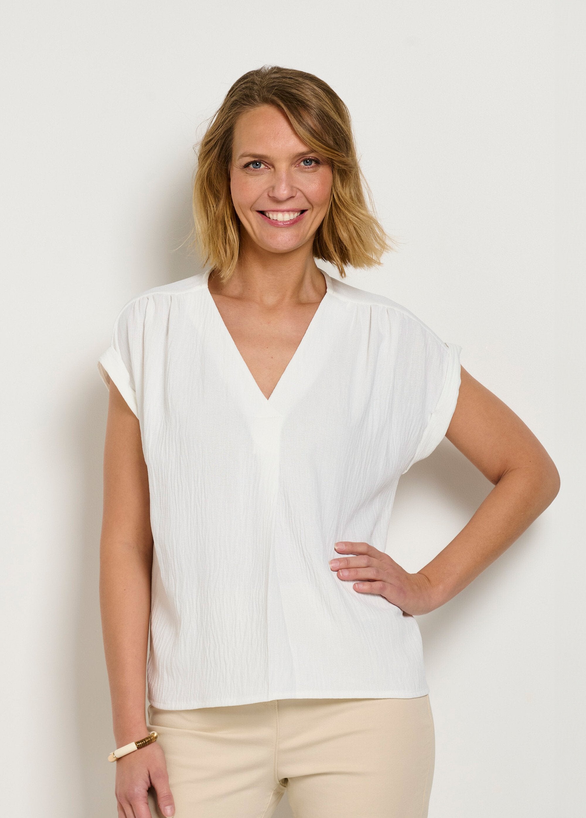 Esta túnica elegante y contemporánea es perfecta para combinar comodidad y estilo. Su escote en pico, realzado por un juego de delicados pliegues en la punta y en los hombros, crea un look refinado. Las mangas fluidas de kimono y el tejido en relieve añaden textura sutil y movimiento a la silueta. Confeccionada con un tejido texturizado de calidad, esta pieza es ideal para un conjunto chic-casual, perfecto para todas las ocasiones.